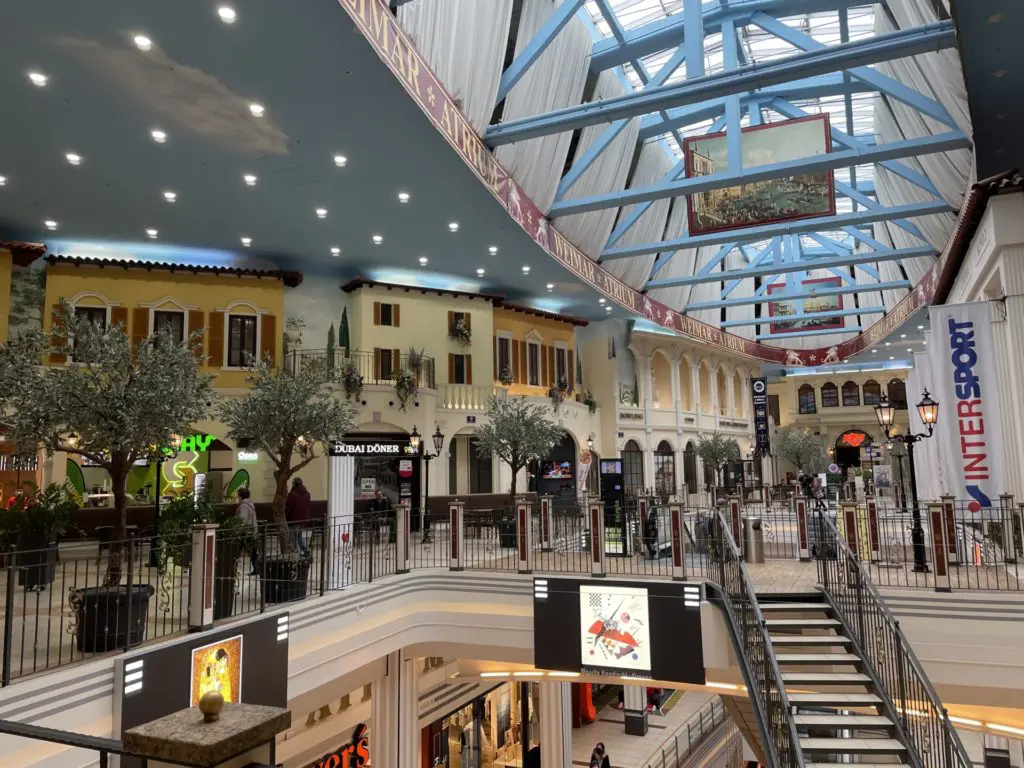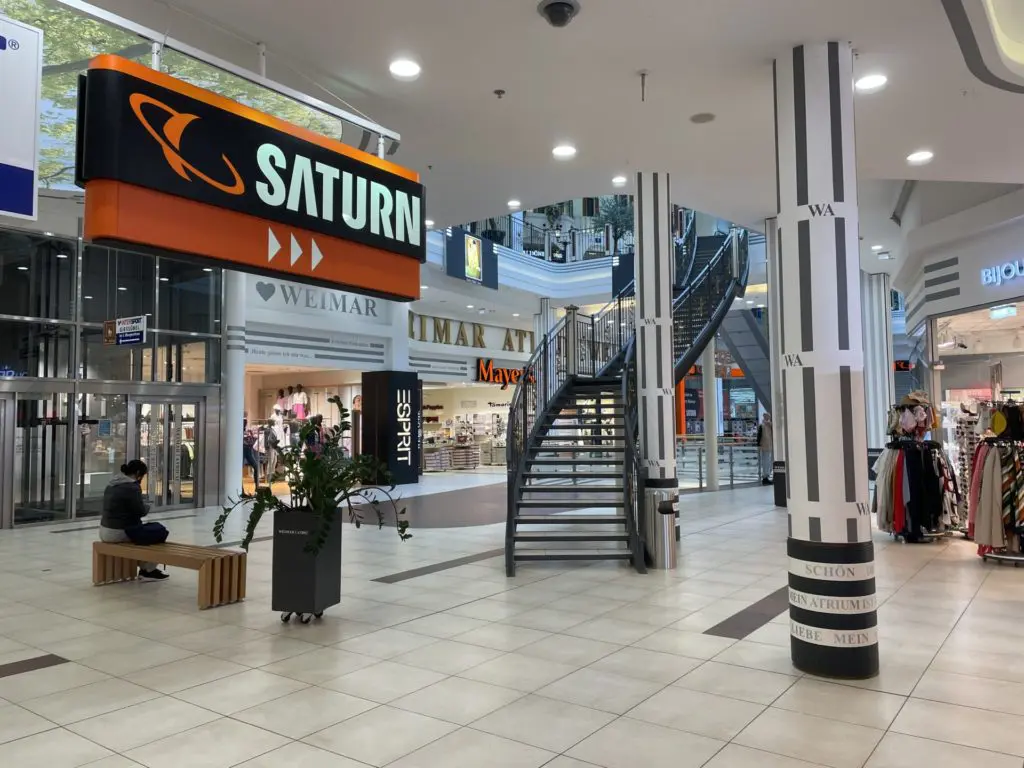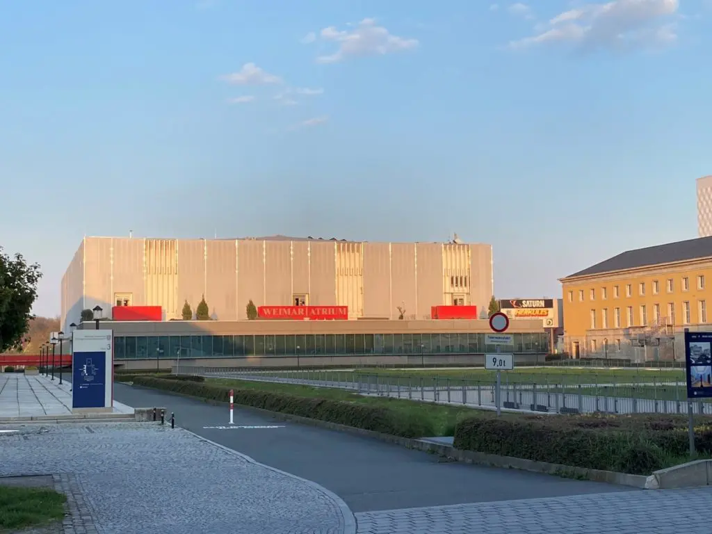 Der Sockel und der obere Hallenteil vereinen sich durch großformatige monochrome Drucke. Im Süden findet man Manets “Frühstück im Grünen”, im Osten ist Da Vincis “Dame mit Hermelin” dargestellt. Beide Motive spiegeln die Gesellschaft und deren Wandel im Laufe der Geschichte wieder und verleihen der Halle ein einheitliches Bild. Abends und in der Nacht wird das Gebäude des Weimar Atrium in den Farben Weiß, Magenta und Blau angeleuchtet und vermittelt damit stets ein modernes Auftreten.